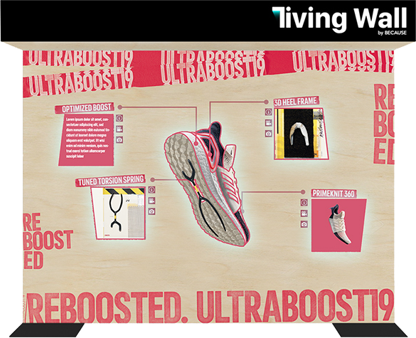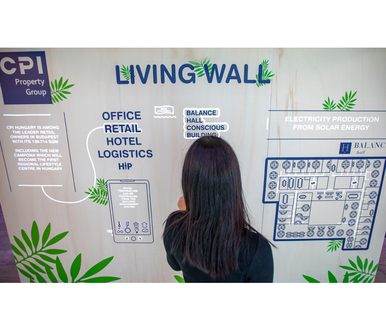 The printed artworks of the Living Wall are complemented with motion pictures, screened by a hidden projector. The wall’s coverage is built from a material that is connected to the identity of the event and it functions as an interactive touch screen which is visible in every light conditions.